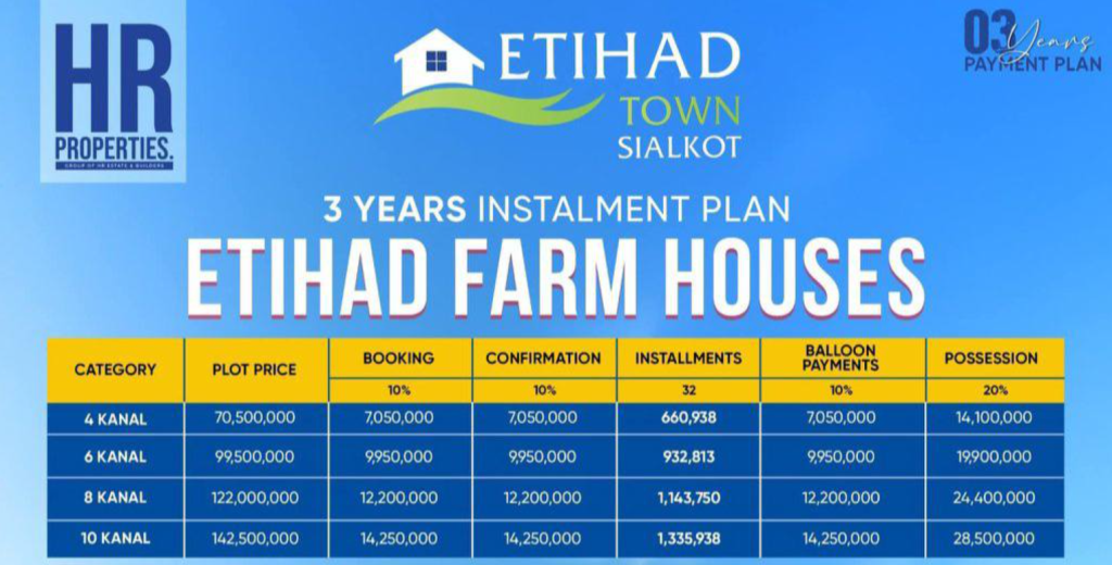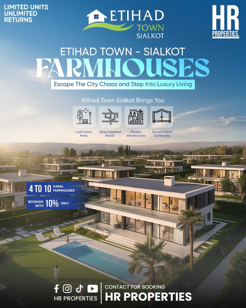 Etihad Town, Sialkot, introduces an exclusive farmhouse society that blends natural beauty with strong commercial potential. Designed for those seeking a peaceful escape, these farmhouses offer a serene environment where you can recharge and disconnect from everyday stress. When not in personal use, the property can generate attractive rental income through family stays or corporate retreats, or be utilized for farming, poultry, or cattle rearing. With limited availability, this opportunity won’t last long.